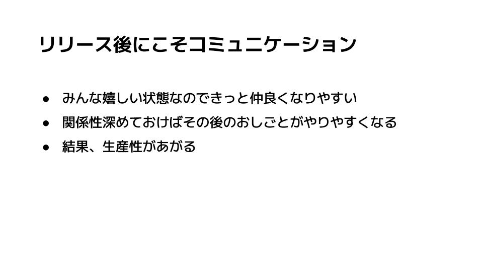 プロダクトを作ってくれたエンジニア、リリース後運用してくれるバックオフィス、セールスの人たちへリリース後(クリア後)にこそコミュニケーションをとってみてはいかがでしょうか。