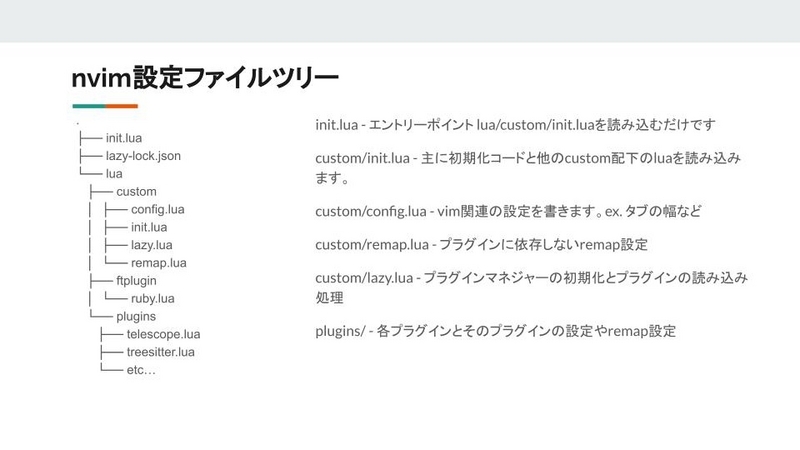 vimを触ったことがある人であれば、vimスクリプトで書いている人も多いかもしれませんが、luaを使うことでファイルを分割してファイルツリーを作ってプラグインごとの設定を分けたりできます。