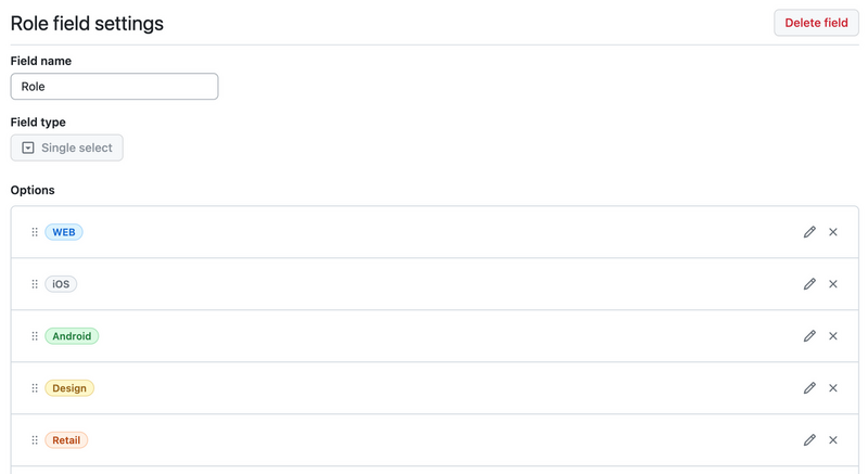 わたしたちのチームでは、以下のような Single select の Custom Field を作成して、連携チーム内の個別チーム割当を可視化していました(画像はイメージです)。