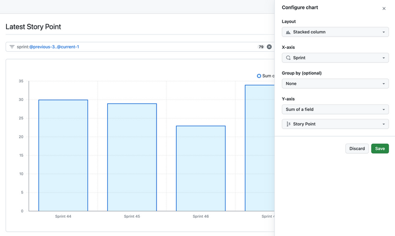 グラフの Y 軸で「Sum of a field」を選択すれば、特定のフィールドの値を合計できるため、先述のストーリーポイントの合計値を可視化できました。