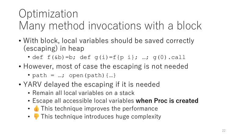 具体的には、ローカル変数環境のエスケープを必要になるまで遅延させる、というテクニックになります。iter{ block } としたとき、ナイーブに作ると block が Proc としてそのスコープよりも長い寿命を持つ「可能性がある」(つまり、iter が終わっても Proc として block が残る可能性がある)ため、block から参照可能なローカル変数(など)をヒープにコピーする(退避する)必要があります。とくに、Ruby には eval があるため、どのローカル変数をコピーすればいいか、事前に知ることができません(そこがわかっていると、ラムダリフティングといった既知の最適化が利用できます)。YARV では、これを本当に必要になるとき、つまり Proc 化するまでこの退避を遅延します。これによって、Ruby で多用されるブロックつきメソッド呼び出しがかなり速くなっています。