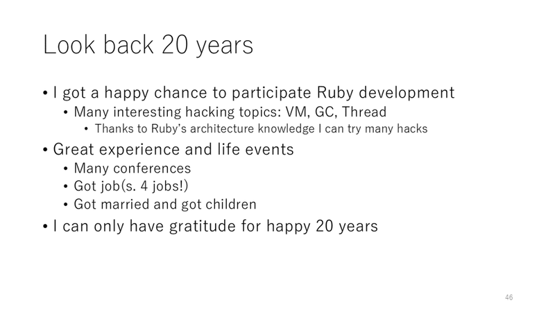 20年を振り返ってみると、Ruby/YARV に携わったおかげでとても面白い研究開発を続けてくることができました。また、多くのライフイベントに恵まれました。感謝しかありません。