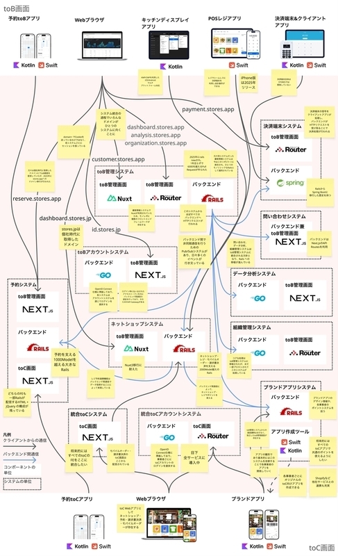 さて、このブログでは STORES Tech Conf 2025 で展示した STORES のシステム構成図を、あらためて Product Blog でも公開させていただこうと思います。私と otariidae さんとで頑張って作ったものです。